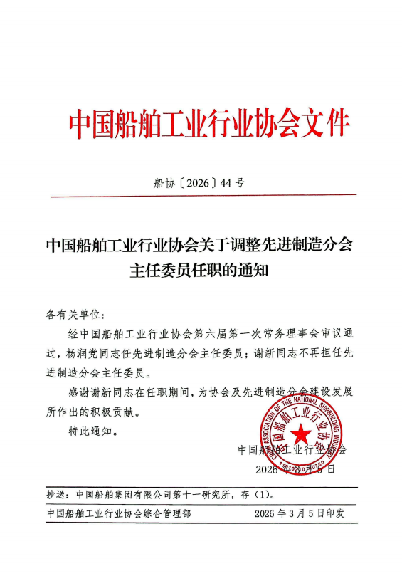 中国船舶工业行业协会关于调整先进制造分会主任委员任职的通知