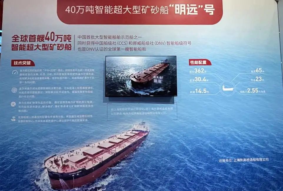 建造的全球首艘40万吨智能超大型矿砂船(VLOC)“明远”号命名交付。该船通过构建服务智能系统的网络平台和信息平台,实现了辅助自动驾驶、能效管理、设备运维、船岸一体通信、货物液化监测等五大智能模块功能,标志着中国智能船舶全面迈入1.0新时代。